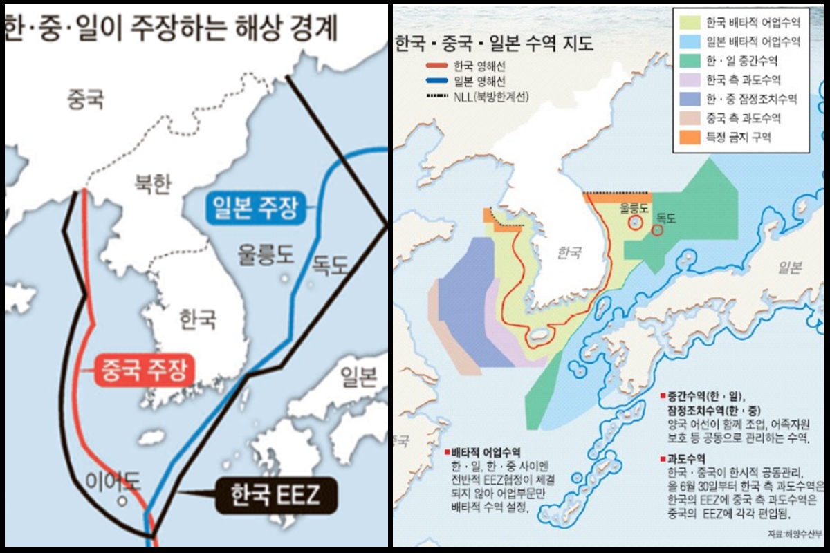 배타적 경제수역(EEZ)은 영해 기선으로부터 200해리에 이르는 수역 중 영해를 제외한 수역으로, 대한민국은 일본 뿐만 아니라 중국과도 배타적 경제수역(EEZ)이 겹쳐있다.