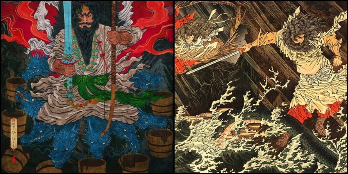 이야기를 들어보니 야마타노오로치(八岐大蛇)라는 여덟 개의 커다란 뱀이 있었는데, 등에는 솔이 나고 눈이 붉었다. 그 괴물은 노인의 딸을 해마다 한 명씩 잡아먹었다고 한다. 그리고 마지막으로 남은 딸이 쿠시나다히메(櫛名田比賣)라고 한다.
