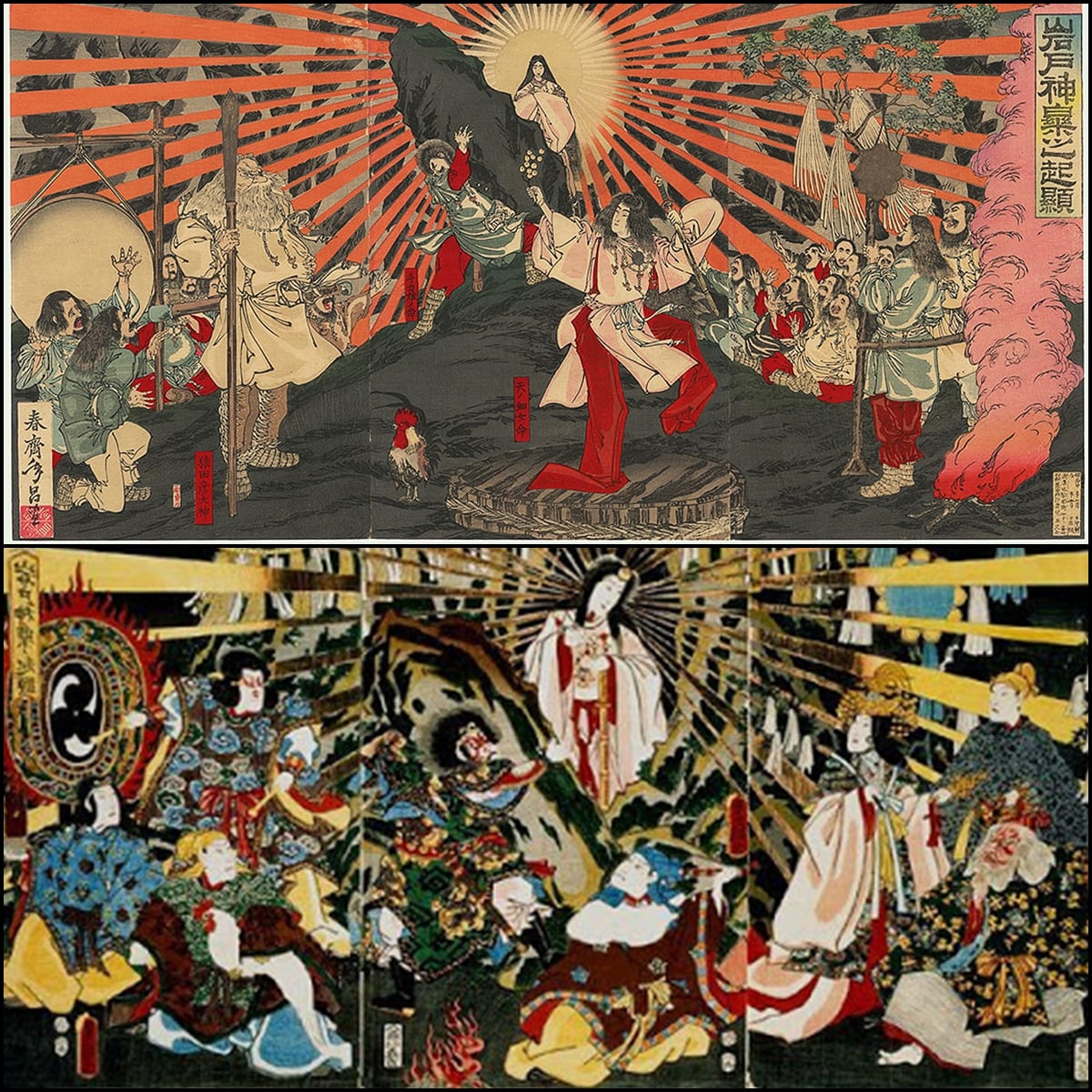 아마테라스는 스사노오의 칼을 받아 깨끗한 우물에 씻고, 세 동강 내어 입에 넣고 우물우물 씹다가 내뱉었더니 세 명의 딸이 태어났다.
