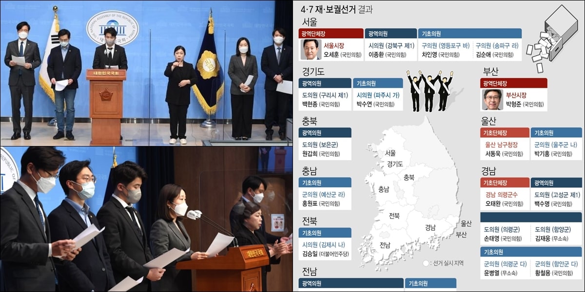 더불어민주당 '오영환·이소영·장경태·장철민·정용기' 초선 의원 5명은 "돌아선 국민의 마음의 원인은 저희를 포함한 민주당의 착각과 오판에 있었음을 자인한다"라며 박원순과 오거돈의 성 비위 문제와 추미애와 윤석열 갈등, 내로남불 논란, 인국공 문제, 보선 참패 원인을 야당과 언론, 청년 탓으로 돌리는 태도 등 모든 부분을 조목조목 꼬집어 반성하겠다는 입장을 밝혔다.