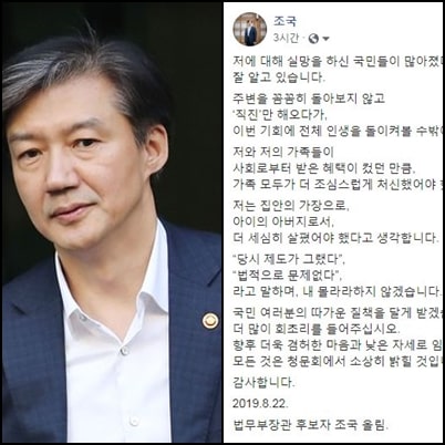 조국 前 장관님은 과거 SNS에 공개했던 소신 발언들이 '위선'이라고 지적받는 것을 본인이 인정했다. 기자 간담회에서 "그 시절 한 말들이 돌아와 저를 치고 있는 사실에 다시 한번 글의 중요함을 새삼 깨닫는다"라고 말했다.