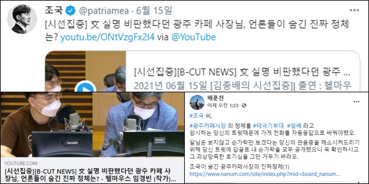 광주 카페 사장님은 페이스북에 '#광주카페사장의 정체를 #태극기부대 #일베라고 암시하는 당신의 트윗 때문에 가게 전화를 자동응답으로 바꿔야했오. 달님은 보지 않고, 손가락만 보겠다는 당신의 관음증을 해소시켜드리기 위해 당신 트윗에 답글로 내 손가락을 모두 공개했으니 꼭 확인하시고 그 괴상망측한 호기심을 그만 거두기 바라오'라고 게시했다.