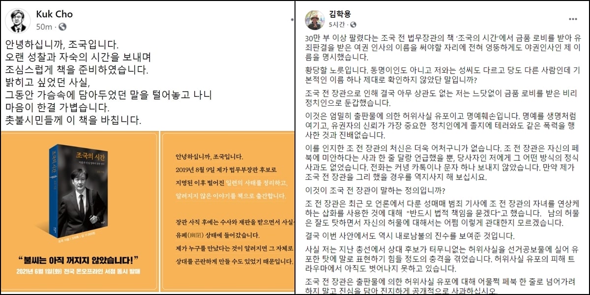조국 前 장관님은 페북에 '김학용 전 의원께서 언론 인터뷰를 통하여 정식 사과를 요청하셨기에, 다시 한번 사과드립니다. 저에게 김 전 의원님의 전화번호가 없기에 이렇게 말씀드립니다. 실수 발견 후 인쇄된 책에서는 수정되었다고 합니다'라고 게시했다.