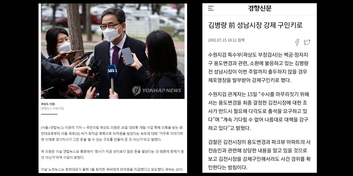 이재명 경기지사가 변호사였던 시절에 '김병량 성남시장'이 박살난 적이 있다. 그때 이재명 변호사에게 제보를 받아 김병량 성남시장을 곽상도 검사가 체포했다고 한다.