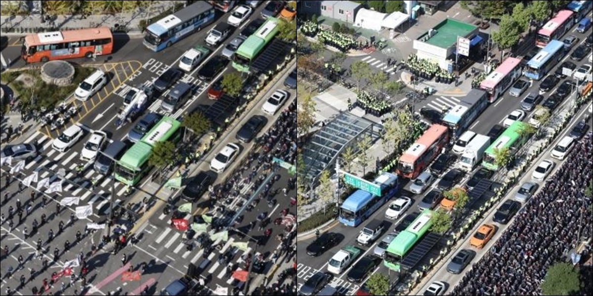 종로구와 중구 일대에 흩어져 있던 민주노총 조합원들이 1시 30분 집행부의 집결 지시에 따라 서대문역사거리로 일제히 이동했고, 30분 만에 일대 도로를 완전히 점거했다.