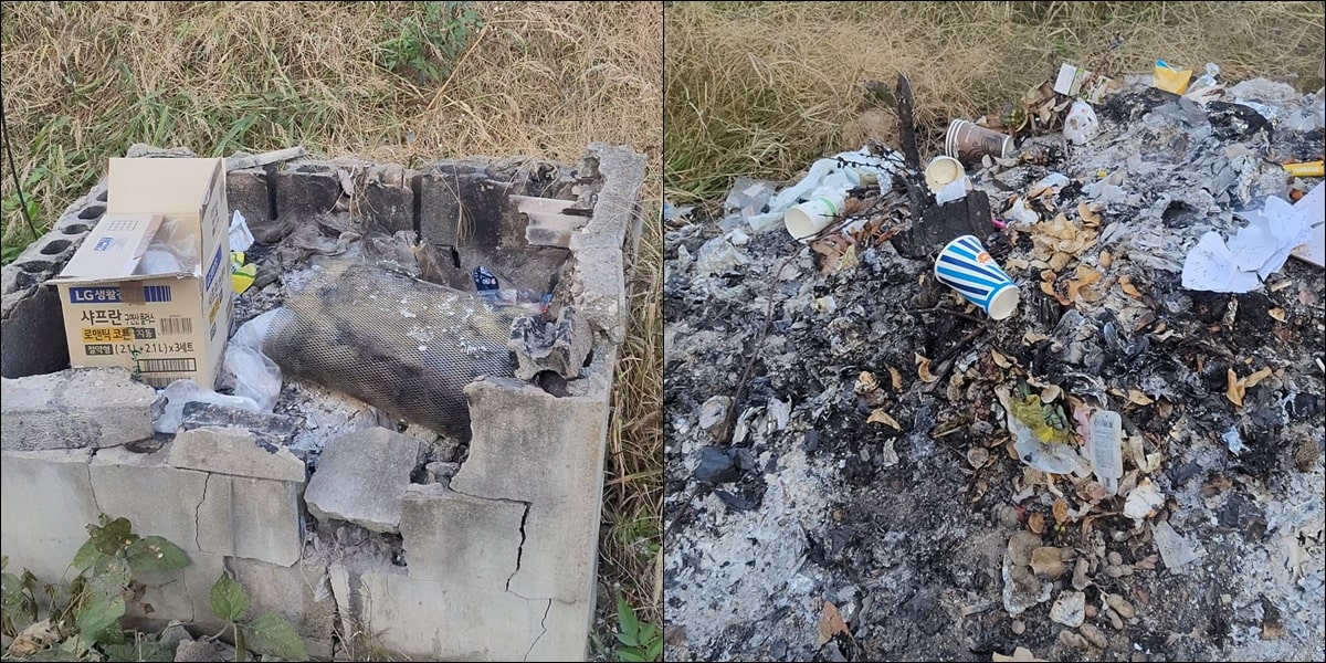 오른쪽 사진을 보면 얼마나 많은 양의 쓰레기를 불법으로 소각했는지.. 정말 충격적이다. 태우고, 그위에 다시 쓰레기를 던져놓고 또 태우고..