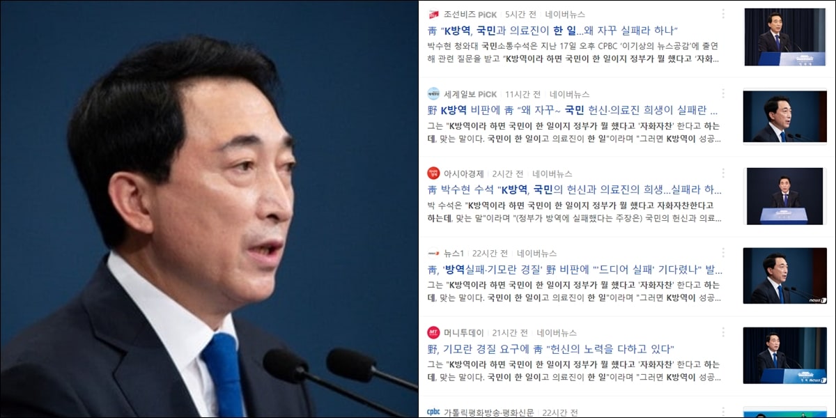 2021년 12월 16일 박수현 청와대 국민소통수석은 CPBC '이기상의 뉴스공감'에 출연한 자리에서 "K방역이라 하면 국민이 한 일이지 정부가 뭘 했다고 자화자찬한다고 하는데, 맞는 말"이라며 "(정부가 방역에 실패했다는 주장은) 국민의 헌신과 의료진의 희생이 실패했다는 이야기인가"라고 발언했다.