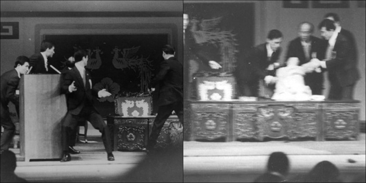 이 장면은 TV로 생중계되었고, 두 사람이 실려나간 후, 예정대로 행사는 진행되었다.