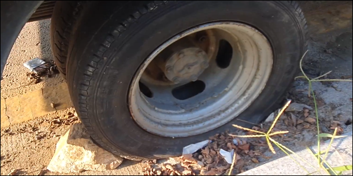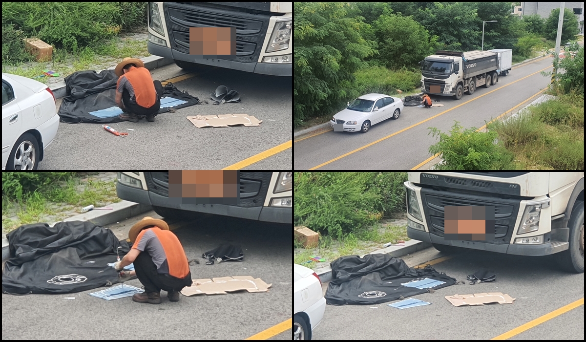 택배차량에 가까이 가보니, 정말 황당했다. 펑크가 난 상태였다. 그냥 여기에 주차를 하기 위해 택배차량을 주차해놓은 것 같았다. 덤프트럭은 항상 택배차량 앞이나 뒤에 주차를 한다.