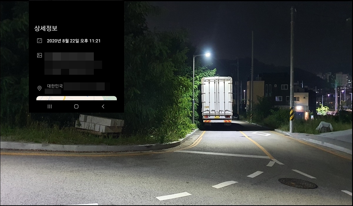 차량이 어느 정도 진입한 후에도 밤에는 덤프트럭이 잘 보이지 않고, 끝에 있는 택배차량은 전혀 보이지 않는다.