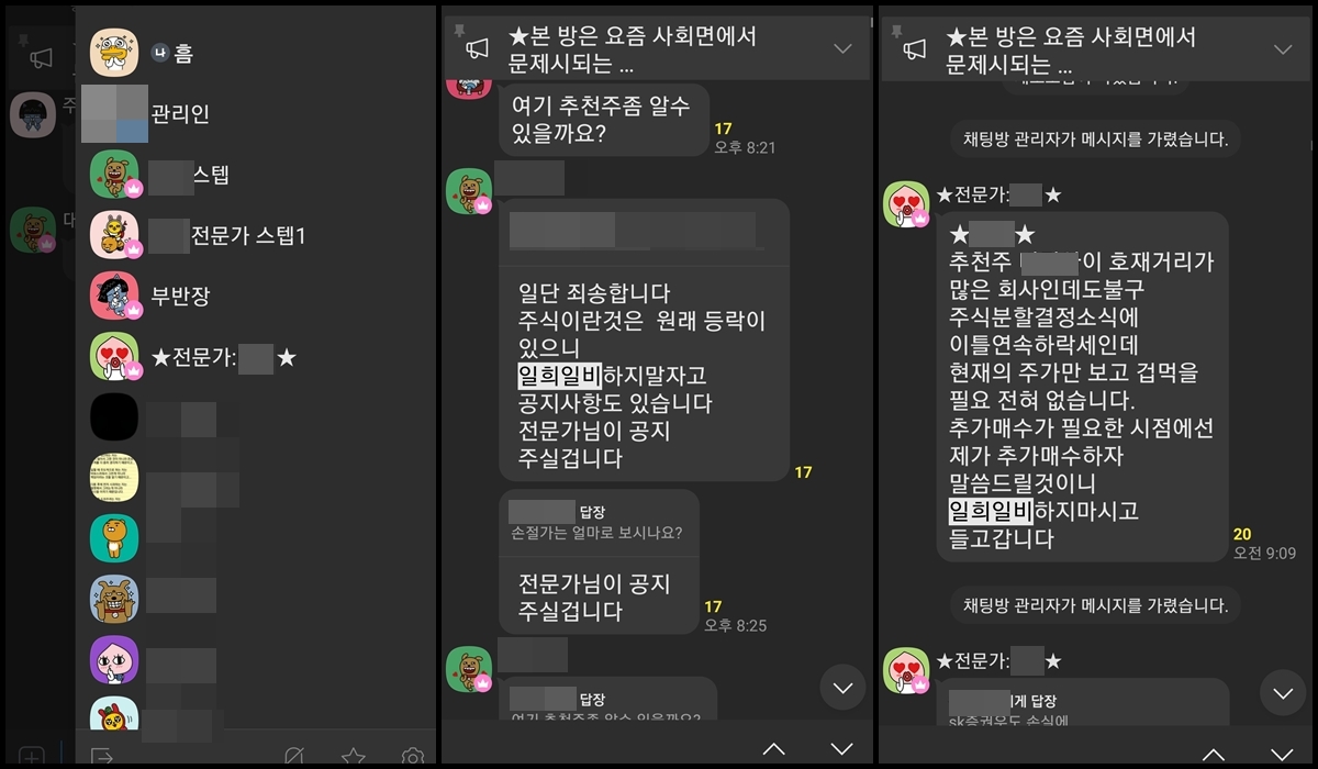 그럼 주식 리딩방의 사람들은 '신규종목 매수 준비'라고 카톡을 보낸다. 이 와중에도 일희일비하는 사람들의 들을 가리고, 내보낸다.